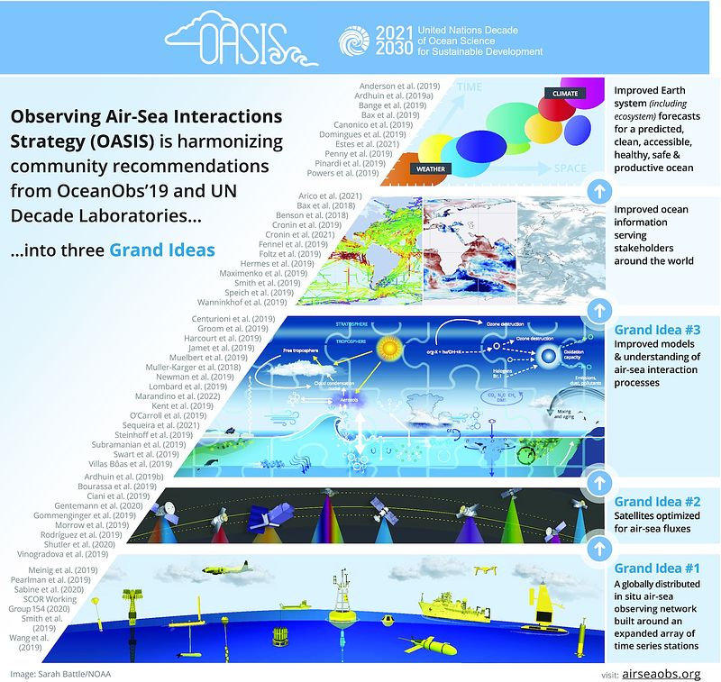 The Observing Air–Sea Interactions Strategy (OASIS) is a new United Nations Decade of Ocean Science for Sustainable Development programme working to develop a practical, integrated approach for observing air–sea interactions globally for improved Earth system (including ecosystem) forecasts, CO2 uptake assessments called for by the Paris Agreement, and invaluable surface ocean information for decision makers. Our “Theory of Change” relies upon leveraged multi-disciplinary activities, partnerships, and capacity strengthening. Recommendations from >40 OceanObs’19 community papers and a series of workshops have been consolidated into three interlinked Grand Ideas for creating #1: a globally distributed network of mobile air–sea observing platforms built around an expanded array of long-term time-series stations; #2: a satellite network, with high spatial and temporal resolution, optimized for measuring air–sea fluxes; and #3: improved representation of air–sea coupling in a hierarchy of Earth system models. OASIS activities are organized across five Theme Teams: (1) Observing Network Design & Model Improvement; (2) Partnership & Capacity Strengthening; (3) UN Decade OASIS Actions; (4) Best Practices & Interoperability Experiments; and (5) Findable–Accessible–Interoperable–Reusable (FAIR) models, data, and OASIS products. Stakeholders, including researchers, are actively recruited to participate in Theme Teams to help promote a predicted, safe, clean, healthy, resilient, and productive ocean.